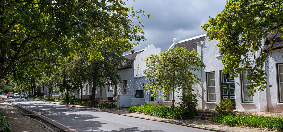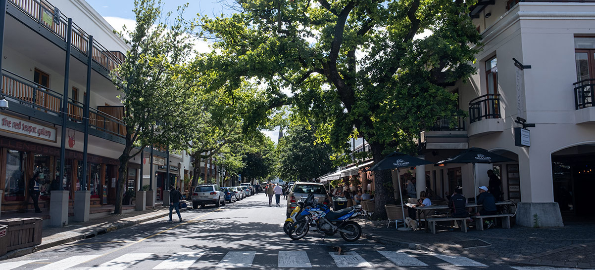 Stellenbosch: Church Street in Stellenbosch, with the University (red roofs, top left), and the Jonkershoek valley (top right) in the distance.